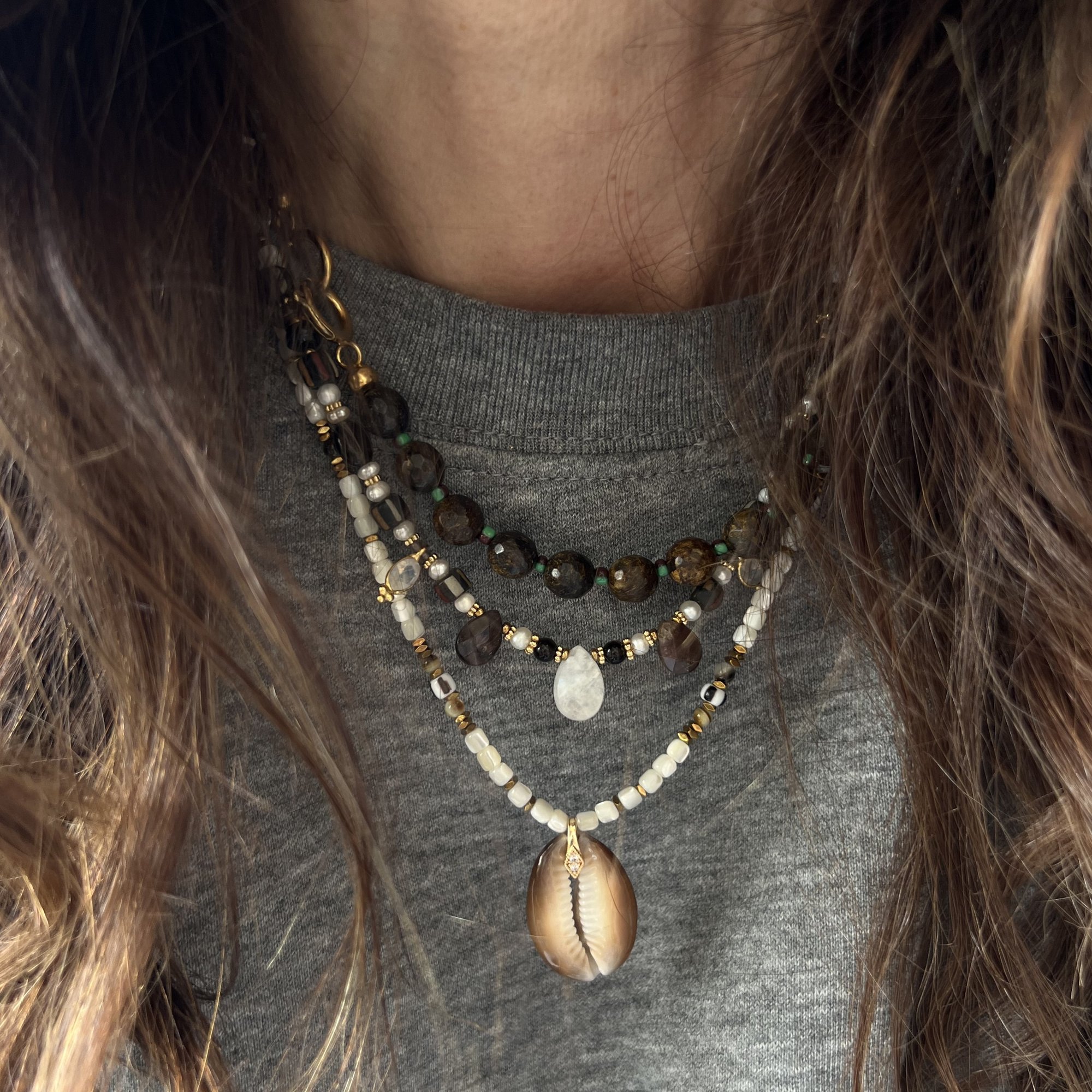 - # 1 : 42 à 47 cm, perles d'eau douces, coquillage, bois sculpté, quartz fumé, onyx, apprêts en acier